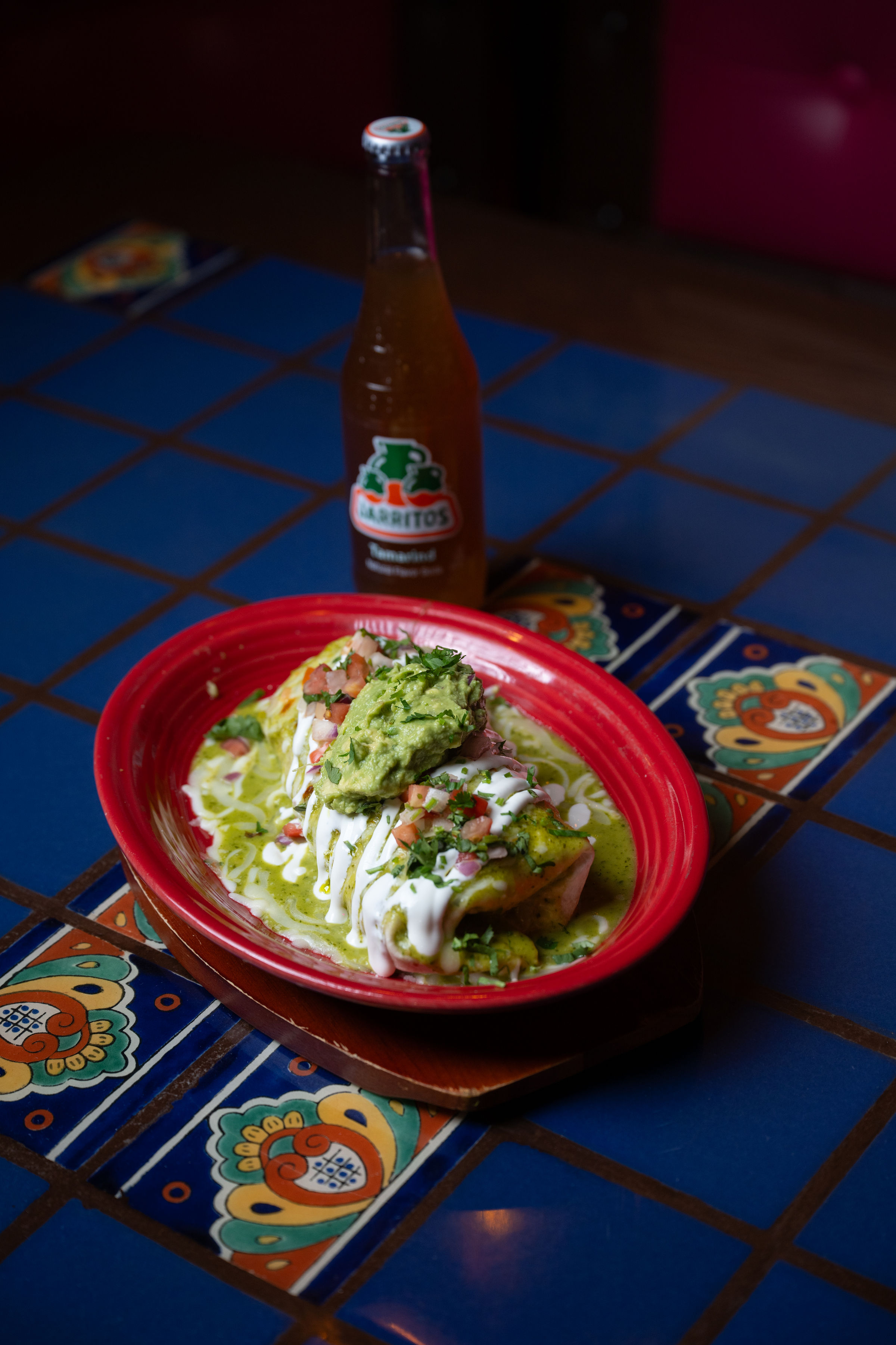 Big flour tortilla stuffed with suadero steak sauteed with onions and peppers/cilantro rice/refried beans/cheese and then smothered on our house made salsa verde served with sour cream/pico de gallo/guacamole